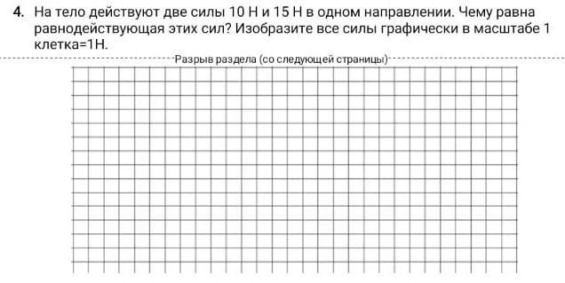 4. На тело действуют две силы 10 Н и 15 Н в одном направлении. Чему равна равнодействующая этих сил? Изобразите все силы графически в масштабе 1 клетка=1Н.