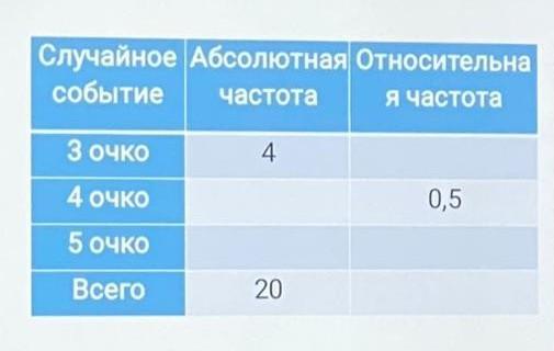 - Событие "4 очка" произошло 5 раз, что составляет абсолютную относительную частоту 5/20 или 0.25.