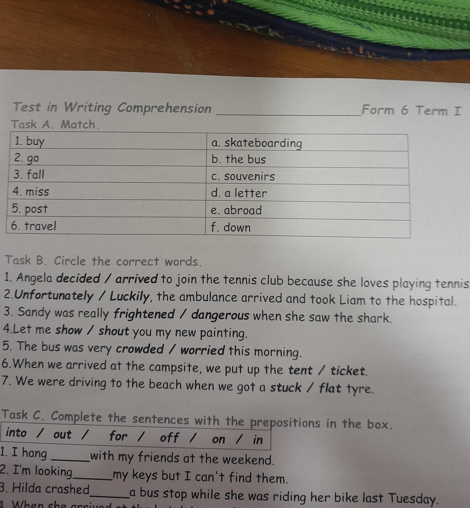 Task B. Circle the correct words. 1. Angela decided / arrived to join the tennis club because she loves playing tennis 2. Unfortunately / Luckily, the ambulance arrived and took Liam to the hospital. 3. Sandy was really frightened / dangerous when she saw the shark. 4.Let me show / shout you my new painting. 5. The bus was very crowded / worried this morning. 6. When we arrived at the campsite, we put up the tent / ticket. 7. We were driving to the beach when we got a stuck / flat tyre.