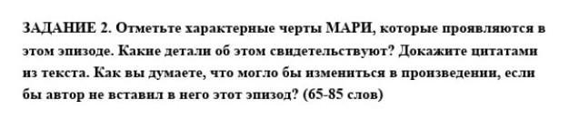 ЗАДАНИЕ 2. Отметьте характерные черты МАРИ, которые проявляются в этом эпизоде. Какие детали об этом свидетельствуют? Докажите цитатами из текста. Как вы думаете, что могло бы измениться в произведении, если бы автор не вставил в него этот эпизод? (65-85 слов)