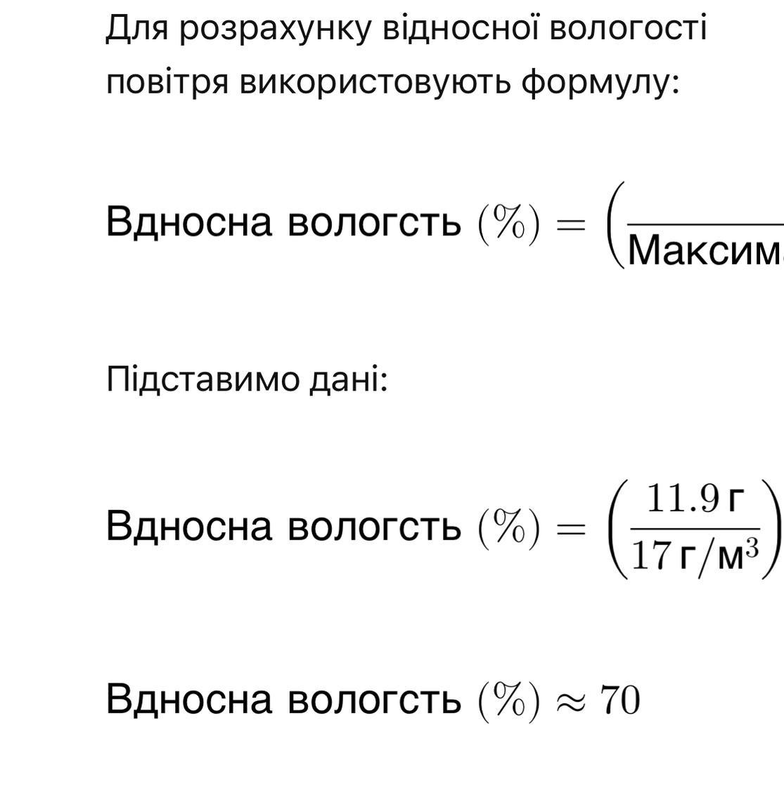 Якою є відносна вологість повітря при температурі +20ОС, якщо в ньому фактично міститься 11,9 г водяної пари при максимально можливій кількості 17 г/м3?