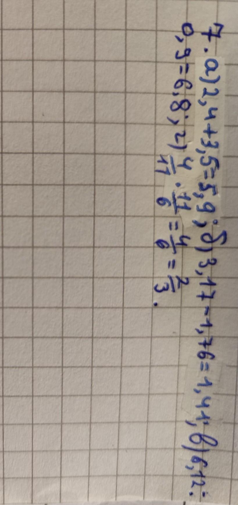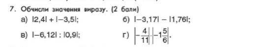 7. Обчисли значення виразу. (2 бали) a) |2,4|+|-3,5|; B) |-6,12|÷ |10,9|; 6) |-3,17| - |1,76| г) |-4/11|×|-1 5/6| очень срочно.