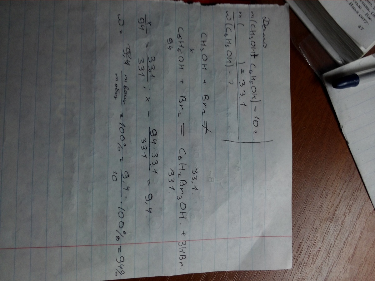 При взаимодействии 10 г метанола и фенола с бромной водой выпало 33,1 г осадка. Определите массовую долю фенола в смеси.
