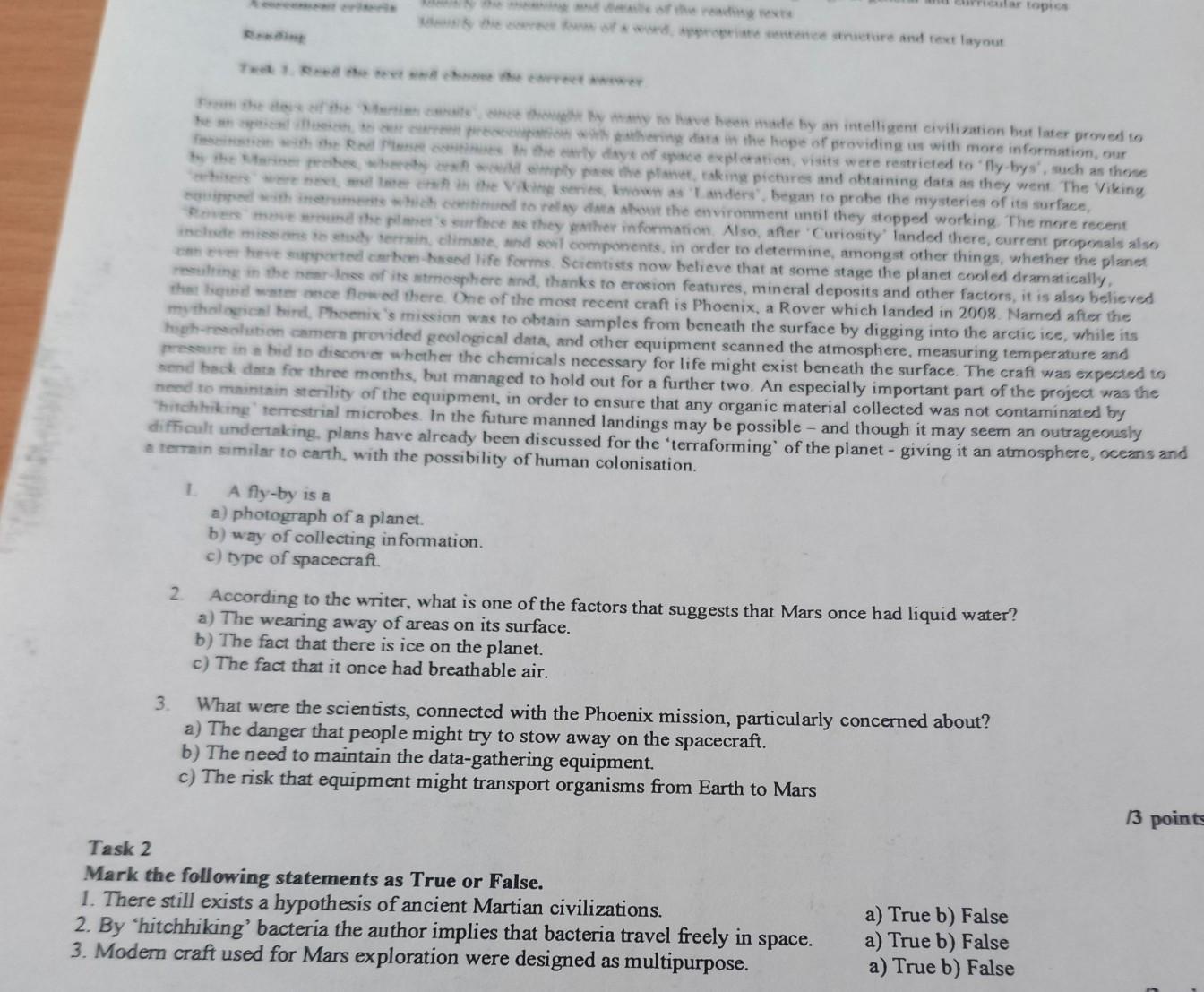 Task 2 Mark the following statements as True or False. 1. There still exists a hypothesis of ancient Martian civilizations. 2. By 'hitchhiking' bacteria the author implies that bacteria travel freely in 3. Modern craft used for Mars exploration were designed as multipurpose space. a) True b) False a) True b) False T LF-L дам 50 балов