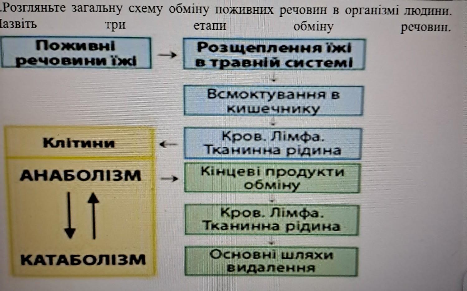 1.Розгляньте загальну схему обміну поживних речовин в організмі людини. Назвіть три етапи обміну речовин.