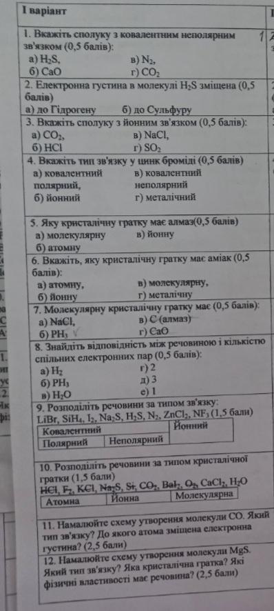 9)полярный NF3 ZnCl LiB. неполярный Na2S H2S SiH4. йонная I2 N2