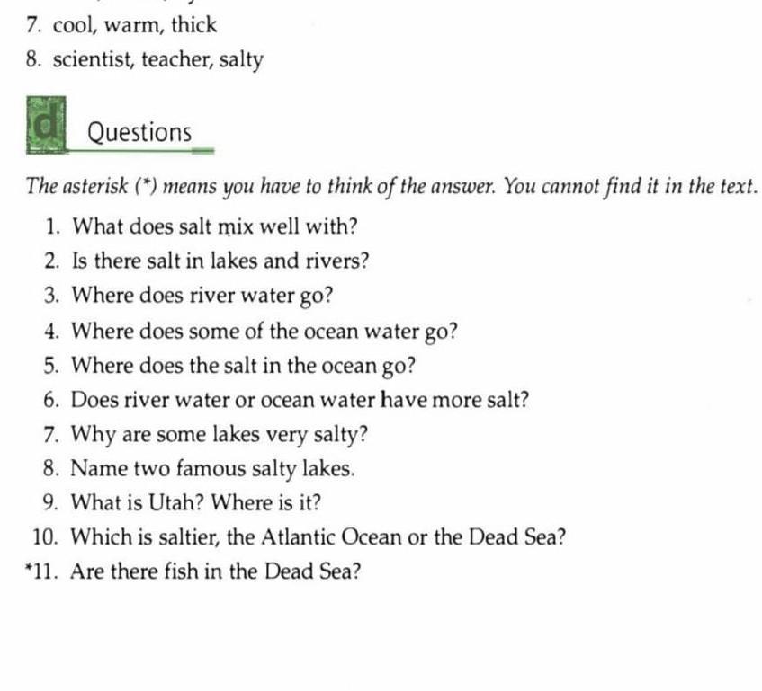 Questions The asterisk (*) means you have to think of the answer. You cannot find it in the text. 1. What does salt mix well with? 2. Is there salt in lakes and rivers? 3. Where does river water go? 4. Where does some of the ocean water go? 5. Where does the salt in the ocean go? 6. Does river water or ocean water have more salt? 7. Why are some lakes very salty? 8. Name two famous salty lakes. 9. What is Utah? Where is it? 10. Which is saltier, the Atlantic Ocean or the Dead Sea? 11. Are there fish in the Dead Sea?