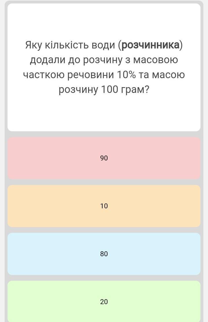 Яку кількість води (розчинника) додали до розчину з масовою часткою речовини 10% та масою розчину 100 грам?