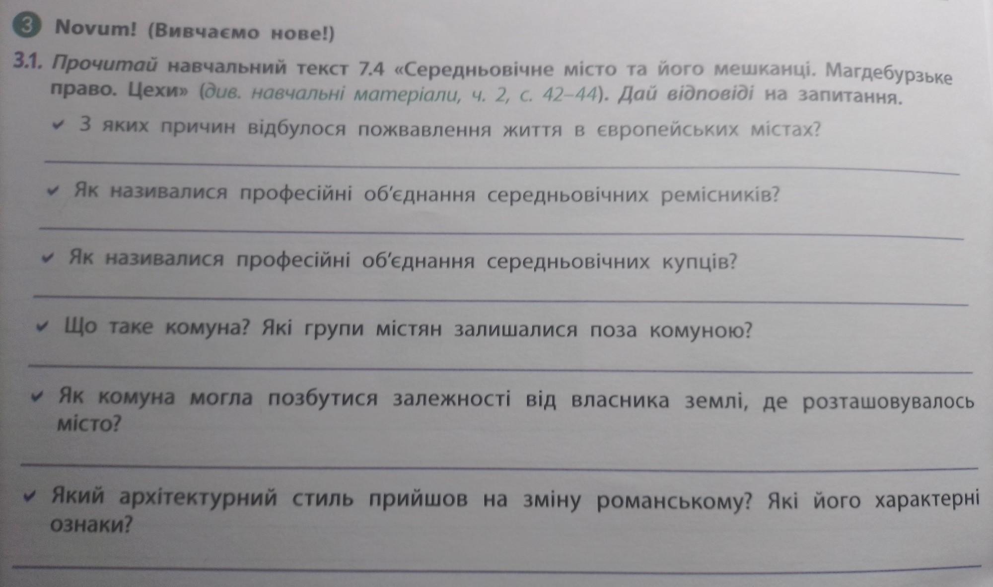 3.1. Прочитай навчальний текст 7.4 «Середньовічне місто та ио право. Цехи» (див. навчальні матеріали, ч. 2, с. 42-44). Дай З яких причин відбулося пожвавлення життя в європейських містах? Як називалися професійні об'єднання середньовічних ремісників? • Як називалися професійні об'єднання середньовічних купців? Що таке комуна? Які групи містян залишалися поза комуною? • Як комуна могла позбутися залежності від власника землі, де розташовува. мiсто? відповіді на запитання. • Який архітектурний стиль прийшов на зміну романському? Які його харак ознаки?
