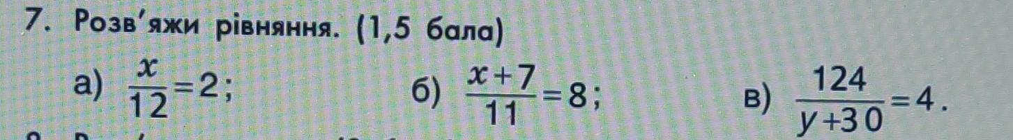 а) x/12=2, б) x+7/11=8, в) 124/ y + 30 =4.