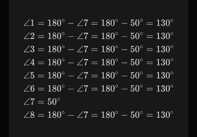 Таким чином, всі кути мають величину 130°, крім кута 7, який дорівнює 50°.