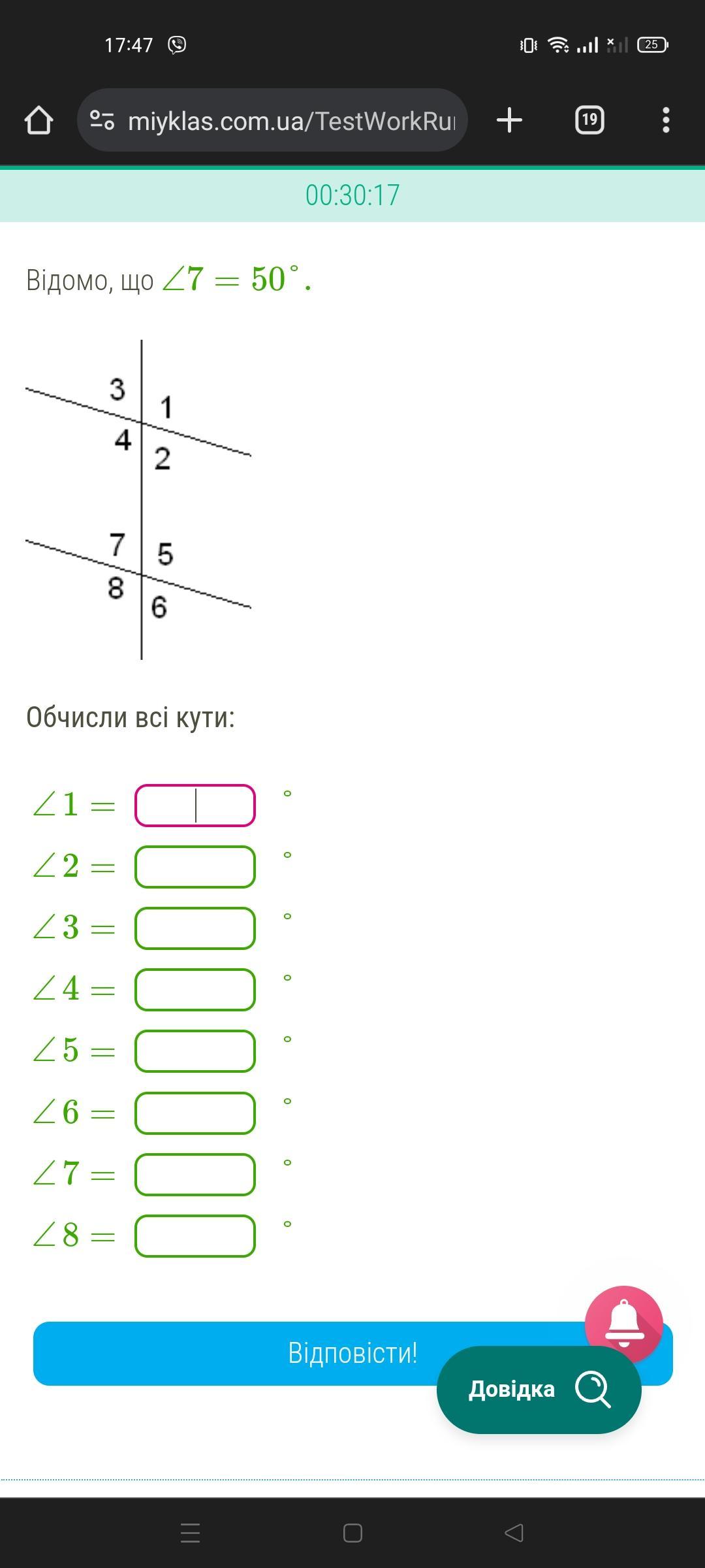 З малюнка видно, що кути 1, 2, 3, 4, 5, 6, 7 i 8 утворюють пряму лінію, тому сума всіх цих кутів дорівнює 180°. Оскільки відомо, що 27 = 50°, то можемо обчислити інші