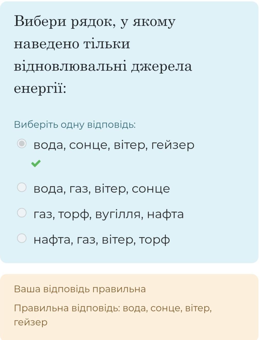 Вибери рядок, у якому наведено тільки відновлювальні джерела енергії: