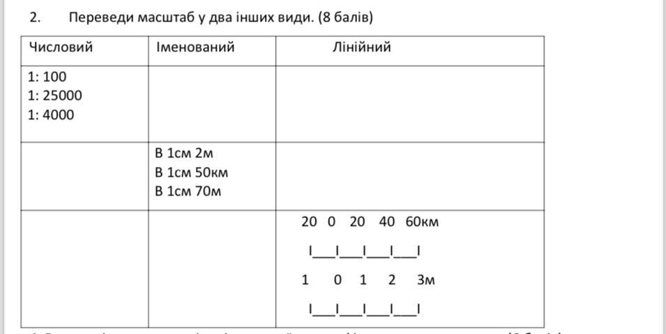 СРОЧНОООО!!!! Переведи масштаб у 2 інших Допоможіть зробити лінійний масштаб перевести його у іменований і числовий а також числовий та іменований перевести в лінійний масштаб будь ласка!!!!!!
