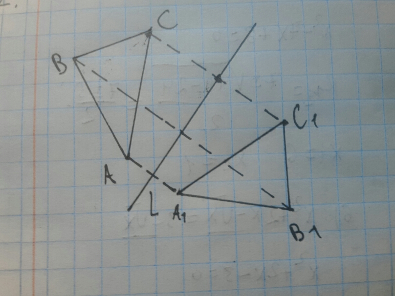 Дан треугольник ABC. Построить треугольник A1,B1,C1, в который перейдет (отобразится) треугольник ABC с симметрией относительно прямой L