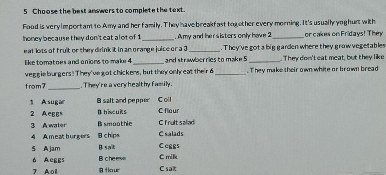 1.Salt and pepper (B)2.Biscuits (B)3.Smoothie(B) 4.Salads(C) 5.A Jam(A)6.Cheese(B)7.Flour(B)