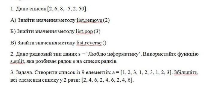 1. list.remove(2) #метод нічого не повертає, видаляє перший елемент зі значенням 2 зі списку