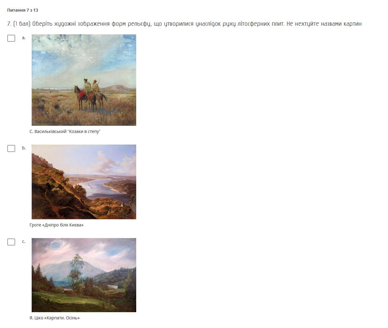 Оберіть художні зображення форм рельєфу, що утворилися унаслідок руху літосферних плит. Не нехтуйте назвами картин