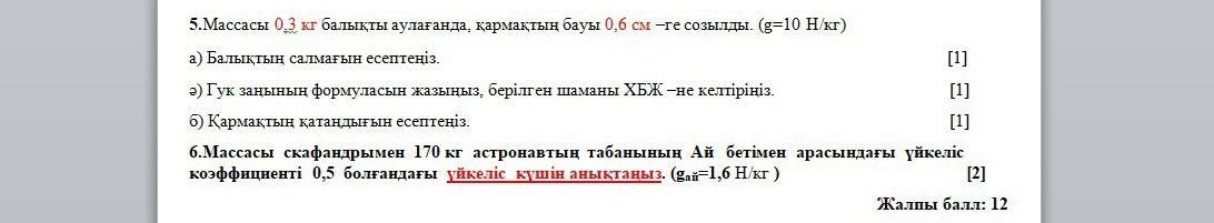 5.Массасы 0,3 кг балыкты аулағанда, кармактын бауы 0,6 см -ге созылды. (g=10 Н/кг)