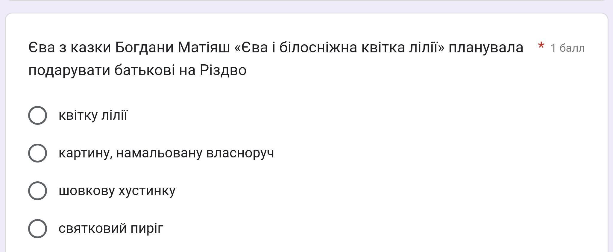 Єва з казки Богдани Матіяш «Єва і білосніжна квітка лілії» планувала подарувати батькові на Різдво О квітку лілії о картину, намальовану власноруч О шовкову хустинку О святковий пиріг