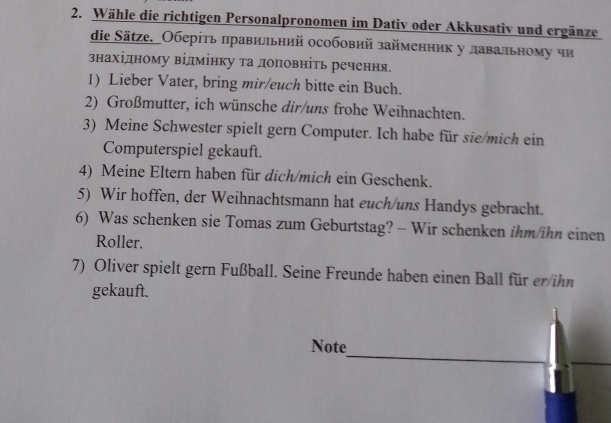 2. Wähle die richtigen Personalpronomen im Dativ oder Akkusativ und ers die Sätze. Оберіть правильний особовий займенник у давальному ч знахідному відмінку та доповніть речення. 1) Lieber Vater, bring mir/euch bitte ein Buch. 2) Großmutter, ich wünsche dir/uns frohe Weihnachten. 3) Meine Schwester spielt gern Computer. Ich habe für sie/mich ein Computerspiel gekauft. 4) Meine Eltern haben für dich/mich ein Geschenk. 5) Wir hoffen, der Weihnachtsmann hat euch/uns Handys gebracht. 6) Was schenken sie Tomas zum Geburtstag? - Wir schenken ihm/ihm Roller. 7) Oliver spielt gern Fußball. Seine Freunde haben einen Ball für er/ihr gekauft.