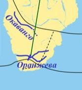 Ця річка не впадає ні в море, ні в озеро. Натомість вона, петляючи численними лабіринтами каналів, втрачає 95% вологи при випаровуванні і зникає в болотах на північному заході пустелі Калахарі.