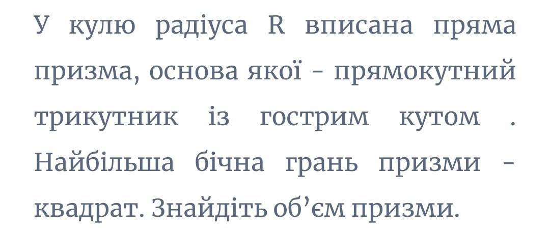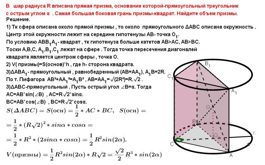У кулю радіуса R вписана пряма призма, основа якої - прямокутний трикутник із гострим кутом . Найбільша бічна грань призми - квадрат. Знайдіть об’єм призми.