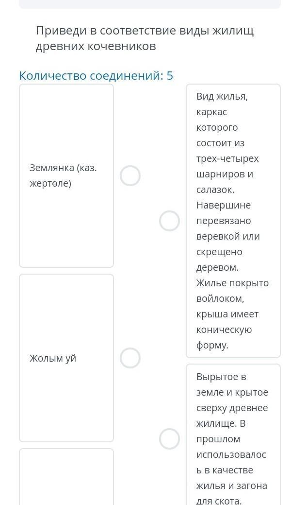 Приведи в соответствие виды жилищ древних кочевников Количество соединений: 5 Землянка (каз. жертөле) Жолым уй Вид жилья, каркас которого СОСТОИТ ИЗ трех-четырех шарниров и салазок. Навершине перевязано веревкой или скрещено деревом. Жилье покрыто войлоком, крыша имеет коническую форму. вырытое в земле и крытое сверху древнее жилище. В прошлом использовалос ь в качестве жилья и загона Для скота. ||>