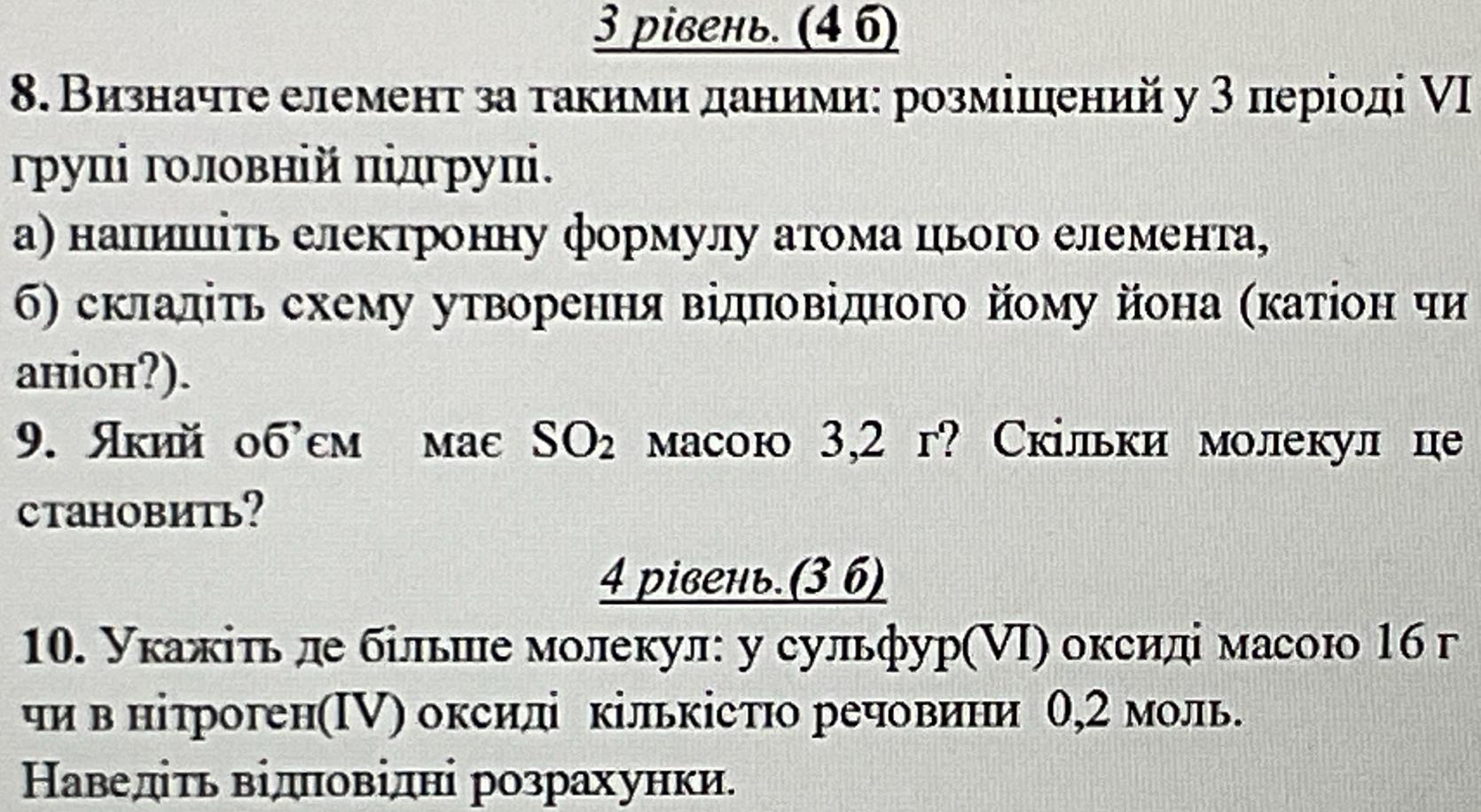 В результаті утворюється аніон з електронною формулою 3s2 3p6, тобто SO32-.9. Який об'єм має SO2 масою 3,2 г? Скільки молекул це становить?Молярна маса SO2 становить 64 г/моль. Отже, 3,2 г SO2 містять 3,2/64 = 0,05 моль SO2.Одиниця об'єму однієї молекули SO2 становить 22,4 л/моль. Отже, 0,05 моль SO2 містять 0,05 * 22,4 = 1,12 л.Відповідь: 1,12 л.Кількість молекул SO2 в 3,2 г становить 0,05 * 6,02 * 10^23 = 3,01 * 10^22 молекул.Відповідь: 3,01 * 10^22 молекул.4 рівень (36)10. Укажіть де більше молекул: у сульфур(VI) оксиді масою 16 г чи в нітроген(IV) оксиді кількістю речовини 0,2 моль.Молярна маса сульфур(VI) оксиду SO3 становить 80 г/моль. Отже, 16 г SO3 містять 0,2 моль SO3.Молярна маса нітроген(IV) оксиду NO2 становить 46 г/моль. Отже, 0,2 моль NO2 містять 0,2/46 = 0,0434 г NO2.Кількість молекул SO3 в 16 г становить 0,2 * 6,02 * 10^23 = 1,204 * 10^23 молекул.Кількість молекул NO2 в 0,0434 г становить 0,0434 * 6,02 * 10^23 = 2,592 * 10^22 молекул.Отже, у сульфур(VI) оксиді масою 16 г більше молекул, ніж у нітроген(IV) оксиді кількістю речовини 0,2 моль.Відповідь: у сульфур(VI) оксиді.Це відповіді на завдання за листком, який ви надіслали. Я сподіваюся, що вони є правильними і корисними