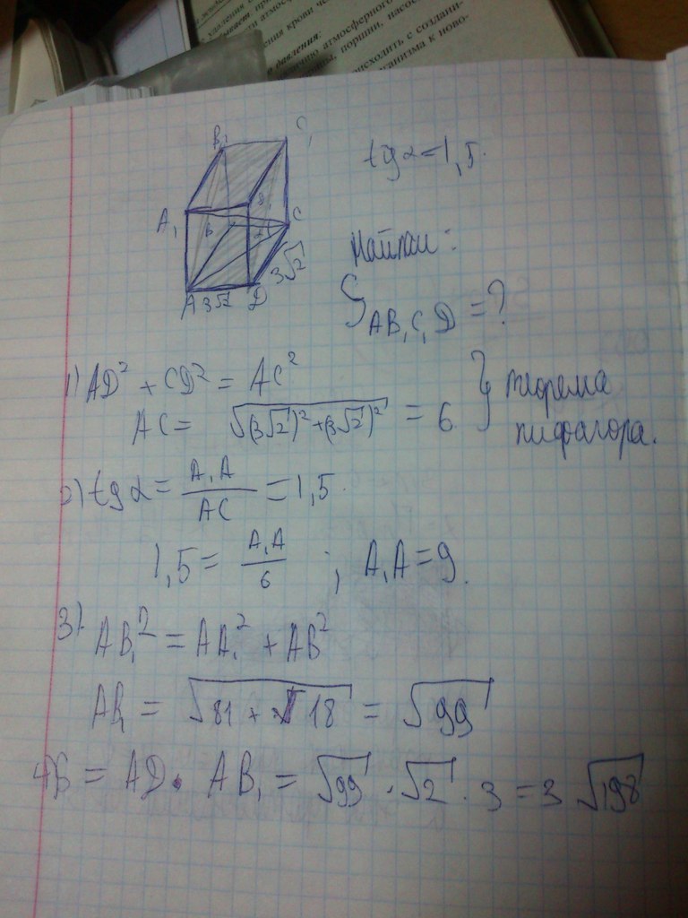 Сторона основания правильной четырехугольной призмы равна 3 корня из 2 , тангенс угла между диагональю призмы и плоскостью основания равен 1.5 . Найдите площвдь сечения проходящего через парралельные диагонали двух противоположных боковых граней призмы.