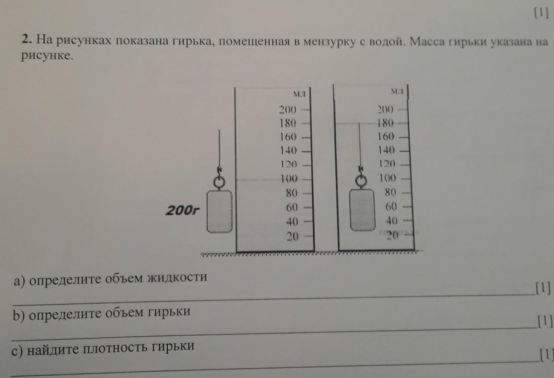 2. На рисунках показана гирька, помещенная в мензурку с водой. Масса гирьки указана на рисунке. 200г а) определите объем жидкости b) определите объем гирьки с) найдите плотность гирьки M.I 200 180 160 140 120 100 80- 60 40 20 M.I 200 180 160 140 120 100 80 60 40 20 [1] [1]