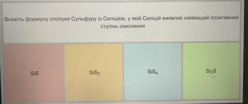 Формула сполуки Сульфуру із Силіцієм, у якій силіцій виявляє найвищий позитивний ступінь окиснення - це SiS2.