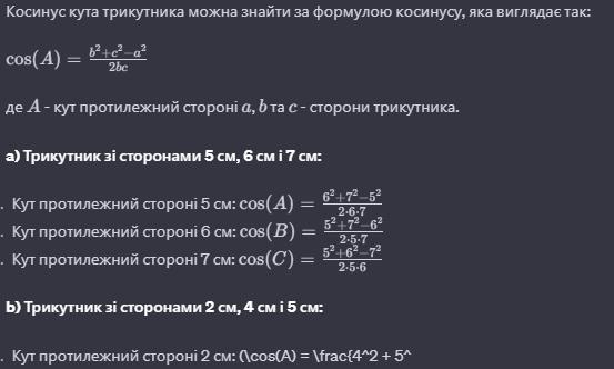 Знайдіть косинуси кутів трикутника зі сторонами: а) 5см, 6см і 7см; б) 2см, 4см і 5см.