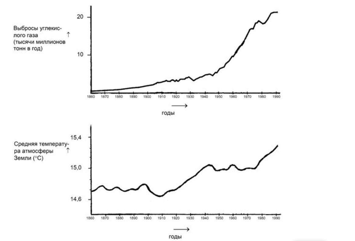 - Если мы посмотрим на график выброса углекислого газа и график среднее температуры атмосферы Земли с 1860 года по 1990 год, то мы увидим следующее: повышение средней температуры на Земле зависит от увеличения выбросов углекислого газа в атмосферу.