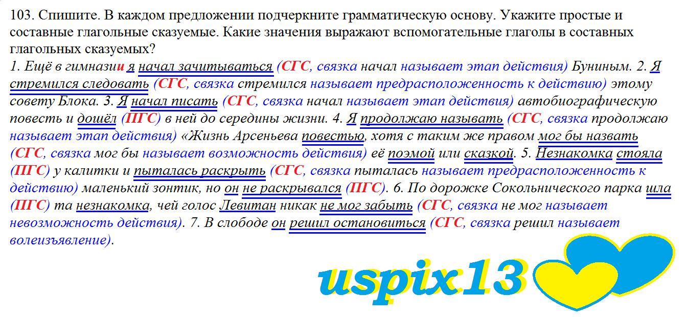 103. Спишите. В каждом предложении подчеркните грамматическую основу. Укажите простые и составные глагольные сказуемые. Какие значения выражают вспомогательные глаголы в составных глагольных сказуемых? 1. Ещё в гимнази.. я начал зачитываться Буниным. 2. Я стремился следовать? этому совету Блока. 3. Я начал писать автобиографическую повесть и дошёл в ней до середины жизни. 4. Я продолжаю называть «Жизнь Арсеньева повестью, хотя с таким же правом мог бы назвать её поэмой или сказкой. 5. Незнакомка стояла у калитки и пыталась раскрыть маленький зонтик, но он не раскрывался. 6. По дорожке Сокольнического парка шла та незнакомка, чей голос Левитан никак не мог забыть. 7. В слободе он решил остановиться.