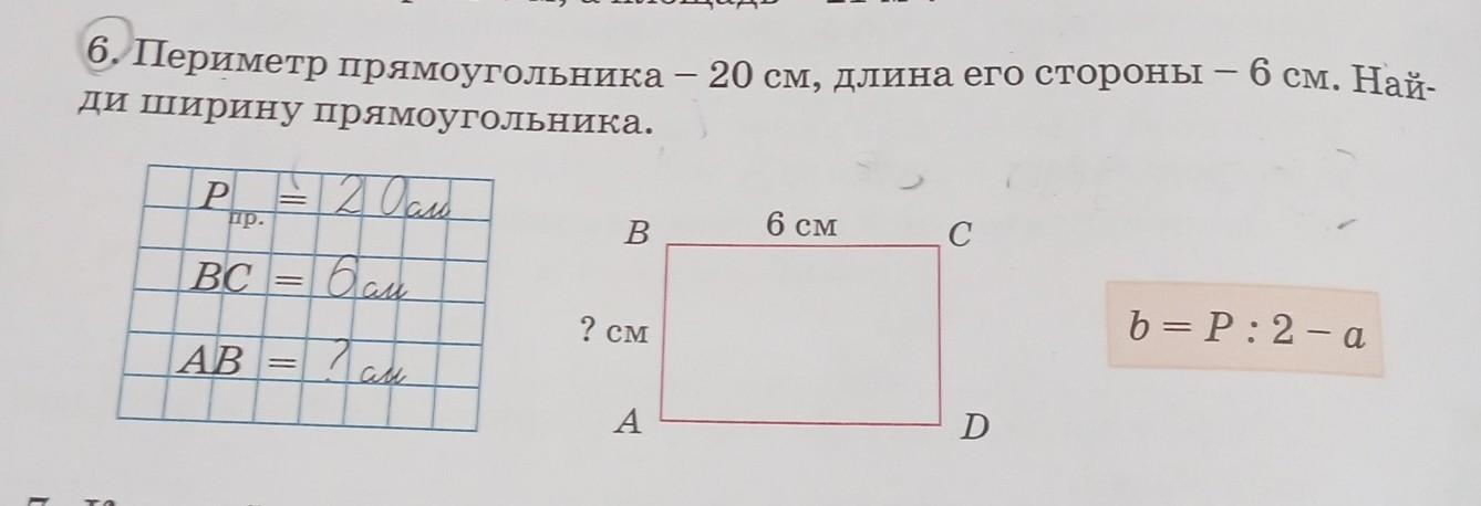 b = P : 2 - a = 20 : 2 - 6 = 10 - 6 = 4 см