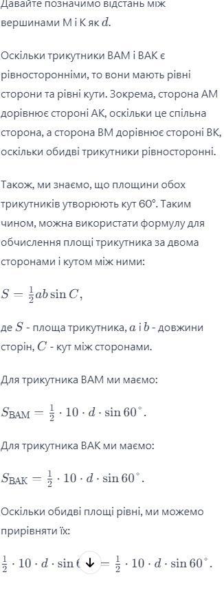 Два рівносторонні трикутники ВАМ і ВАК мають спільну основу АВ = 10см, а їх площини утворюють кут 60°. Знайдіть відстань між вершинами Мі К