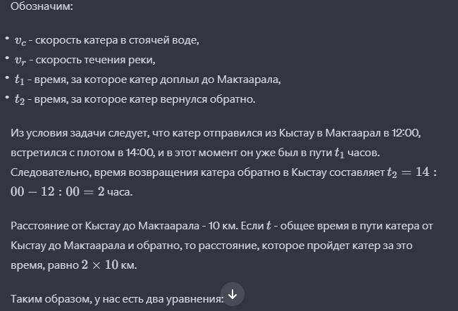 2.1.35.На берегу реки на расстоянии 10 км друг от друга расположены аулы Мактаарал. В 12:00 от Кыстау к Мактаарал стартовали плот икатер. Доплыв до Мактаарала, катер развернулся и повернул обратно, встретившись с плотомв 14:00. Плот при этом проплыл 4 км. В какой момент времени катер прибыл в Мактаарал? Найдите скорость течения реки и скорость катера в стоячей воде, считая эти скорости постоянными.