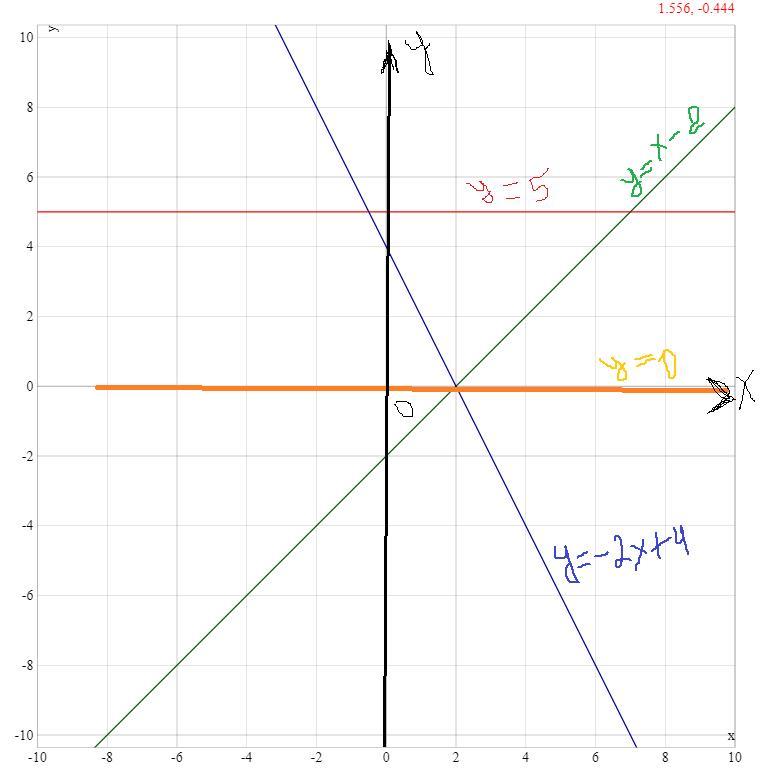 В оодной и той же координатной плоскости постройте графики функции: у=5,у=х-2,у=-2х+4,у=0 Сроочно надо