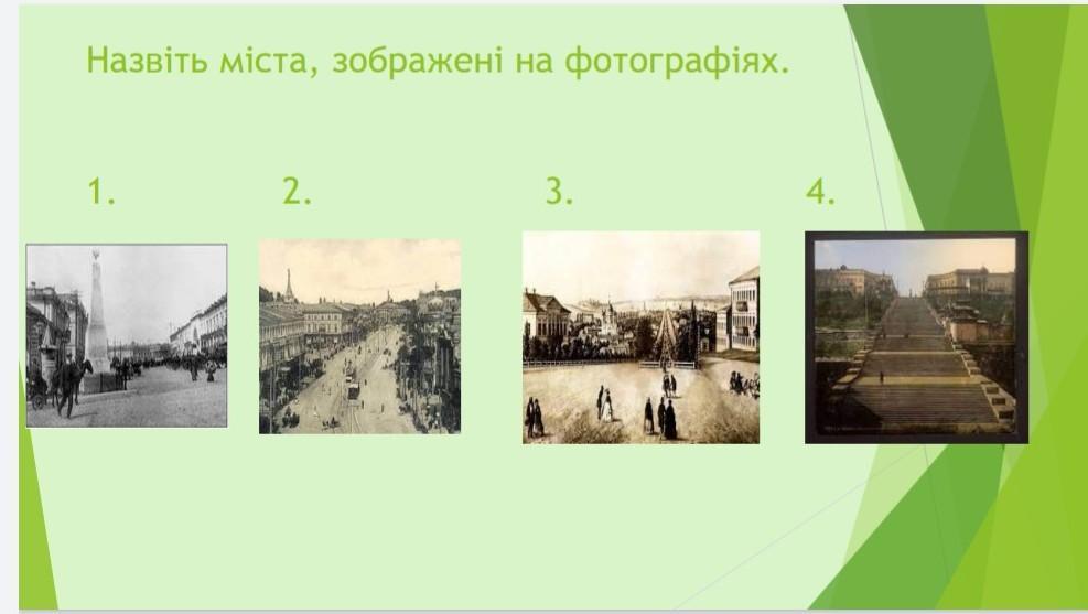 1:Торговельна площа в Харкові. Середина XIX ст.2:Крещатик в довоенном Киеве.3:центр Катеринослава у 1850-х роках.4:Потёмкинская лестница в 1896 году