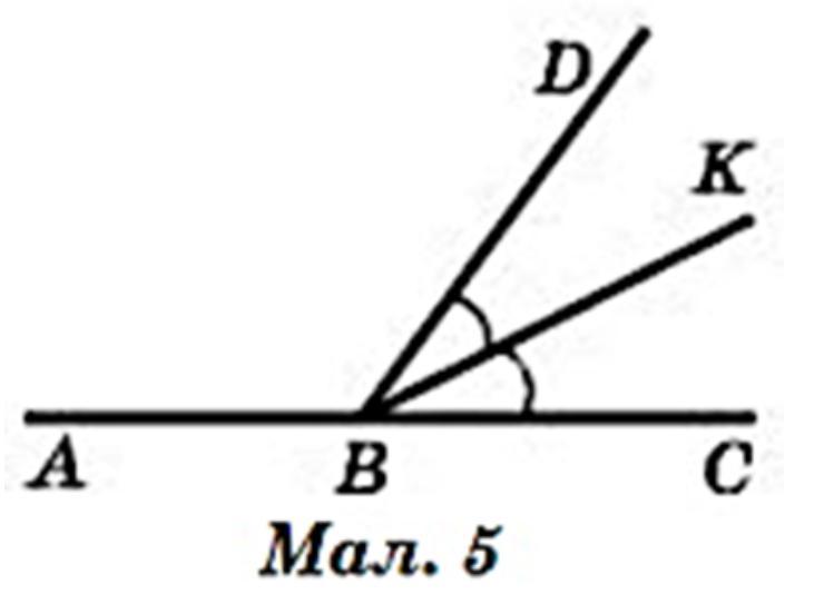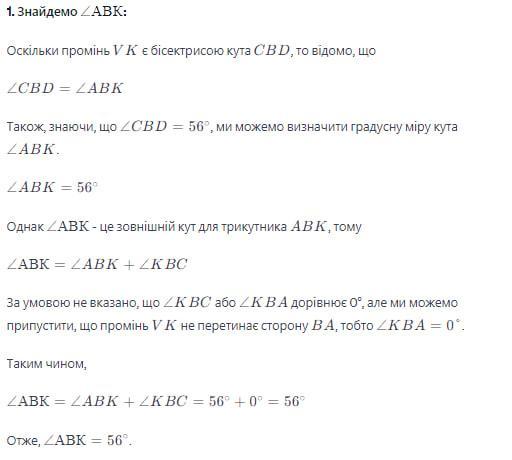 1. Промінь ВК є бісектрисою кута CBD, (мал. 5). Знайди ∠АВК, якщо ∠CBD = 56о.