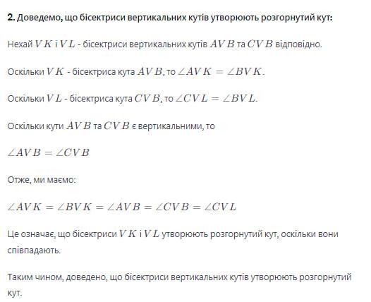 2. Доведи, що бісектриси вертикальних кутів утворюють розгорнутий кут.