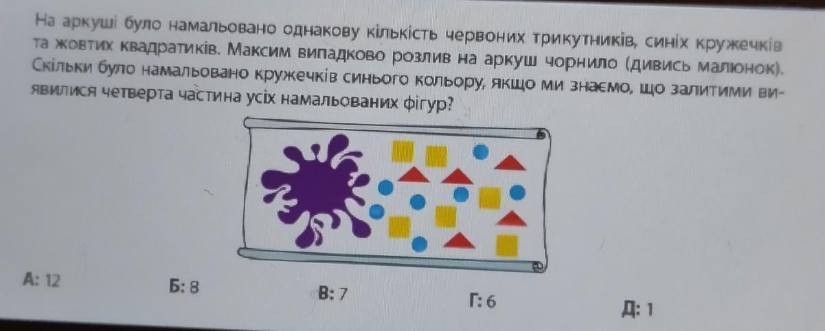 На аркуші було намальовано однакову кiлькiсть червоних трикутників, синіх кружечкiв та жовтих квадратиків. Максим випадково розлив на аркуш чорнило (дивись малюнок). Скільки було намальовано кружечкiв синього кольору, якщо ми знаємо, що залитими ви- явилися четверта частина усiх намальованих фігур? A: 12 Б: 8 B: 7 г: 6 д: 1