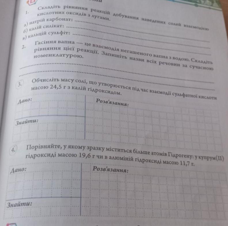 Домашня робота: Складіть рівняння реакцій добування наведених солей смо кислотних оксидів з лугами. 6) калій силікат: ....... а) натрій карбонат: в) кальцій сульфіт: ... 4. 1. 2. 3. Дано: Обчисліть масу солі, що утворюється під час взаємодії сульфатної кислоти 3, у якому зразку міститься більше атомів Гідрогену: у купрум (1 гідроксиді масою 19,6 г чи в алюміній гідроксиду масою 11,7 г. Розв'язання:
