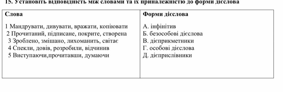 Установіть відповідність між словами та їх приналежністю до форми дієслова.