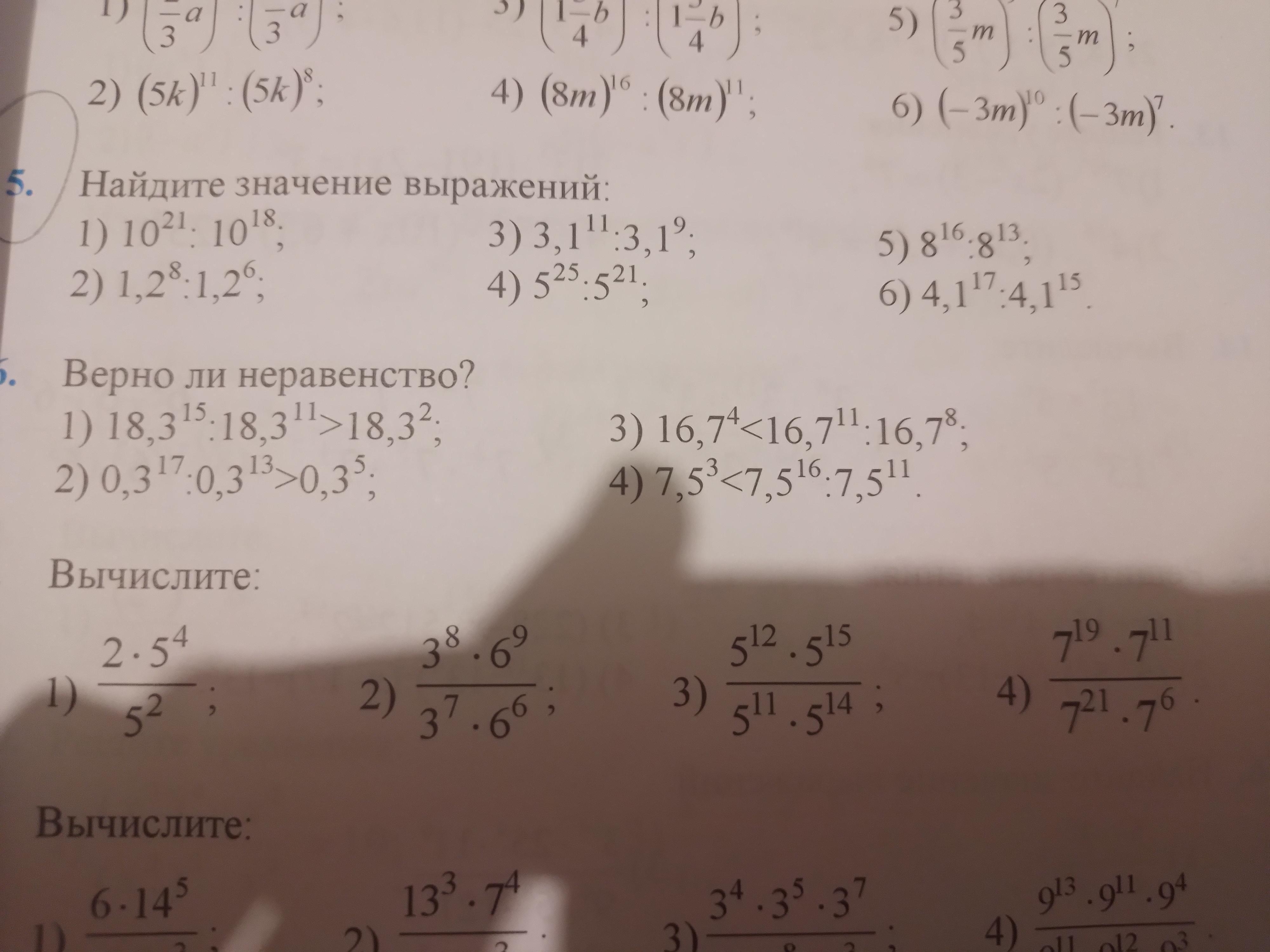 4) 5²⁵:5²¹ = 5⁽²⁵⁻²¹⁾ = 5⁴ = 625
