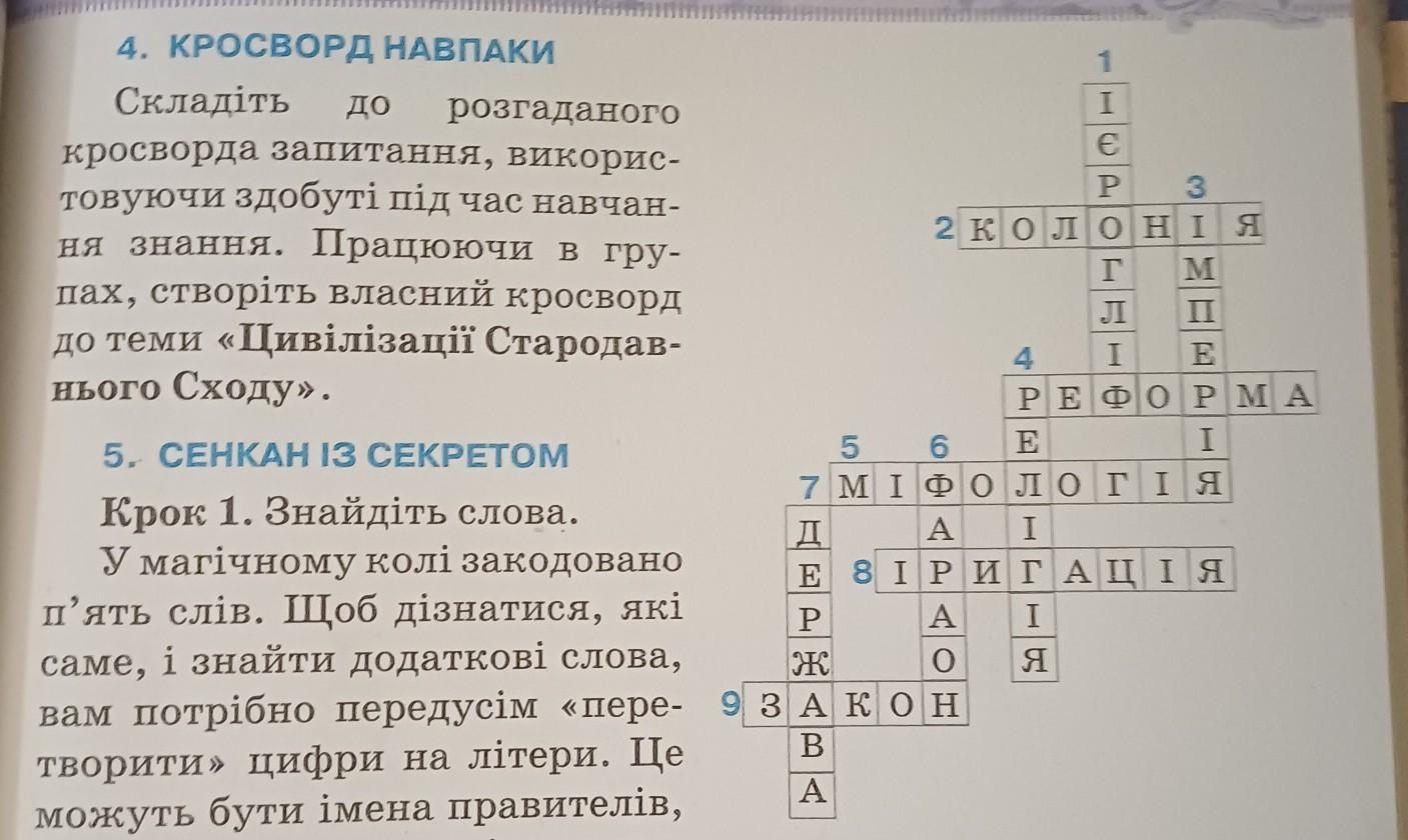 4. Складіть до розгаданого кросворда запитання, використовуючи здобуті під час навчання знання. Працюючи в группах, створіть власний кросворд до теми «Цивілізації Стародавнього Сходу».