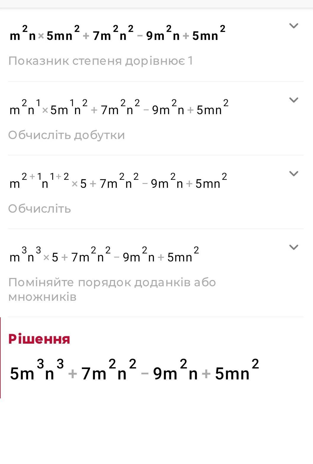 Зведіть многочлен до стандартного вигляду: 1) m²n 5mn²+7m²n²-9m²n + 5mn²; 2) 5a2*3ab2-4ab (-8ab²)3a*5b*4ab.
