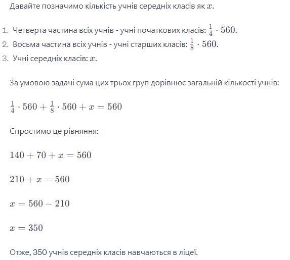 Розв'яжи задачу. У ліцеї навчається 560 учнів. Четверта частина всіх учнiв - учнi початкових класів, восьма частина всіх учнів - учні старших класів, а решта учні середніх класів. Скільки учнів середніх класів навчається в ліцеї? -