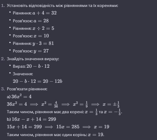 5. Установіть відповідність між рівняннями та їх коренями: 1. 2. a + 4 = 32 3. x : 2 = 5 4. у .3 = 81 20-b12 6. (1 бал) Знайдіть значення виразу: A. 28. Б. 10. 7. (2 бали) Розв'язати рiвняння: 1) 36 x 2 = 4; - B. 32. г. 27. Д. 8. 1755 724-659 + 129-43 -38. 2) 16x-x+ 14 = 299.